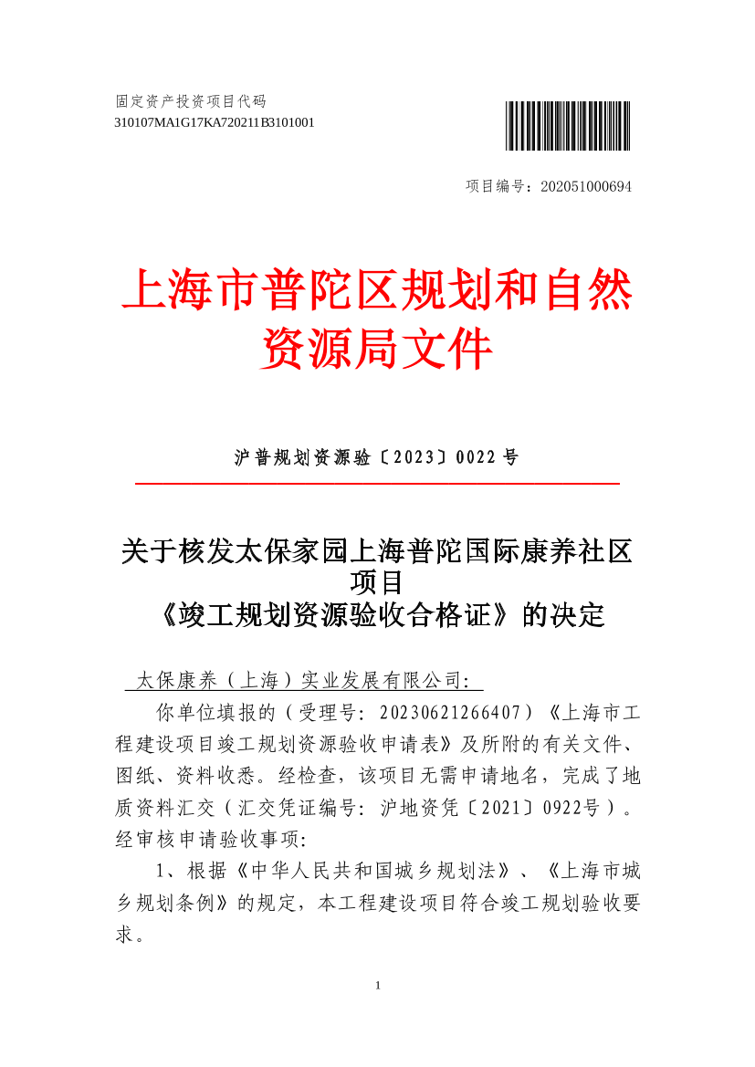 关于核发太保家园上海普陀国际康养社区项目《竣工规划资源验收合格证》的决定