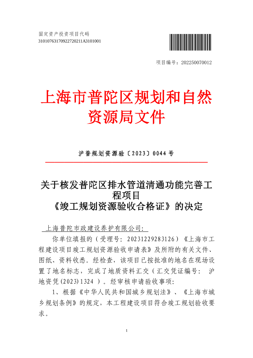 关于核发普陀区排水管道清通功能完善工程项目《竣工规划资源验收合格证》的决定