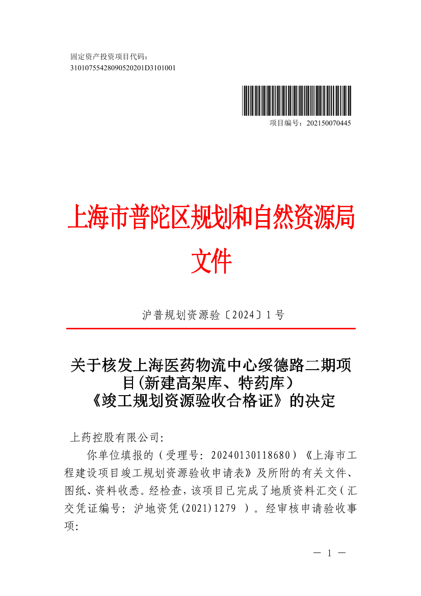 关于核发上海医药物流中心绥德路二期项目(新建高架库、特药库)《竣工规划资源验收合格证》的决定