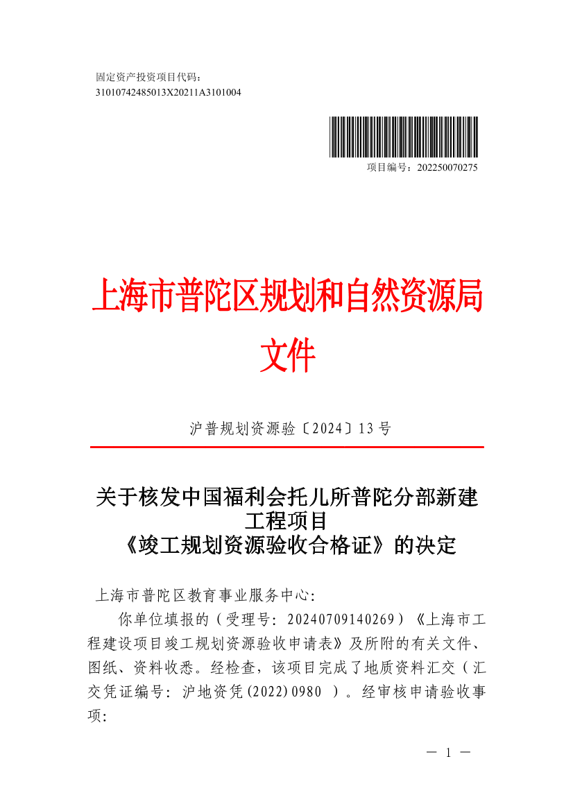 关于核发中国福利会托儿所普陀分部新建工程项目《竣工规划资源验收合格证》的决定