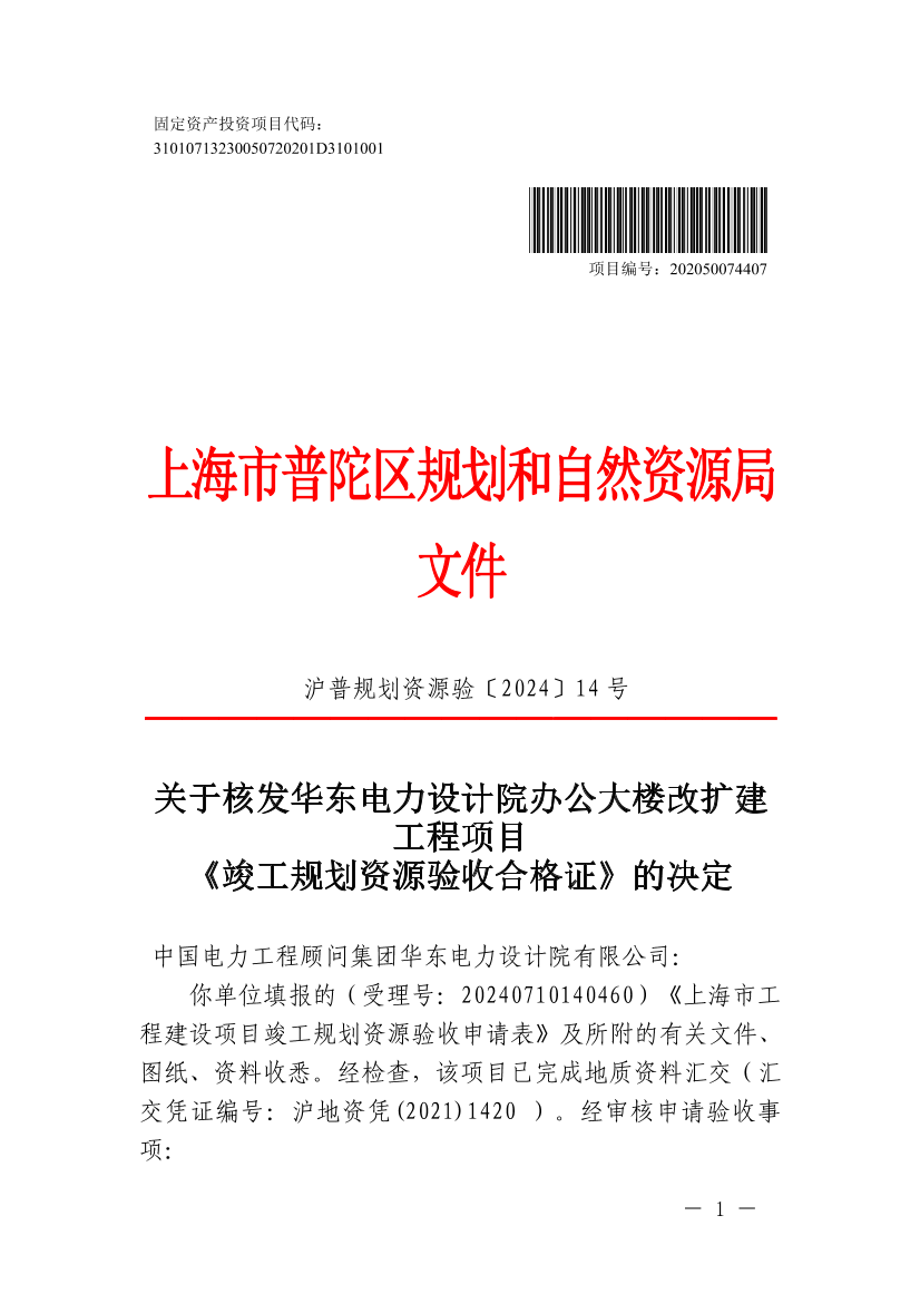 根据《中华人民共和国行政许可法》的规定,准予核发华东电力设计院办公大楼改扩建工程项目《上海市工程建设项目竣工规划资源验收合格证》(编号:沪普规划资源验(2024)JA310107202401024)。