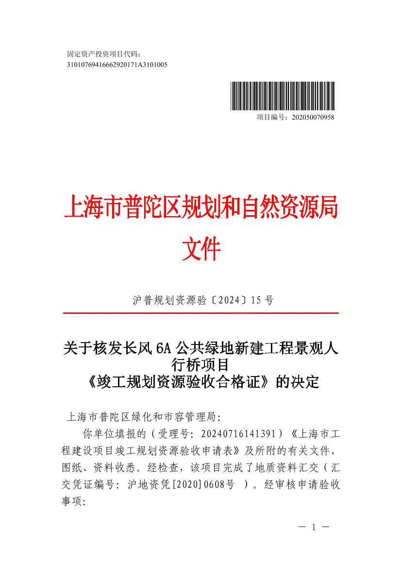 关于核发长风6A公共绿地新建工程景观人行桥项目《竣工规划资源验收合格证》的决定
