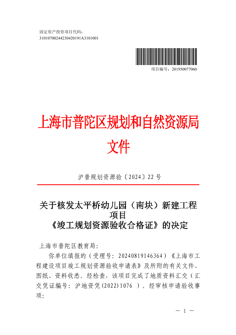 关于核发太平桥幼儿园(南块)新建工程项目《竣工规划资源验收合格证》的决定