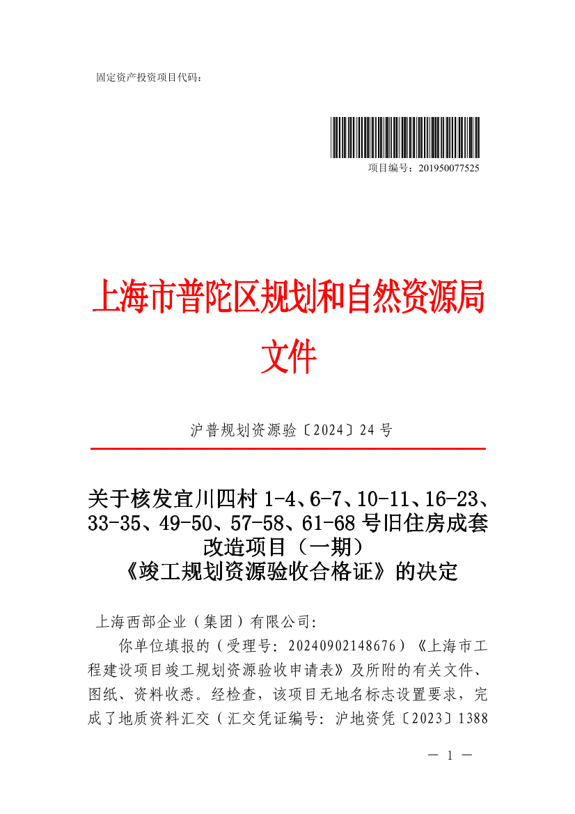 关于核发宜川四村1-4、6-7、10-11、16-23、33-35、49-50、57-58、61-68号旧住房成套改造项目(一期)《竣工规划资源验收合格证》的决定
