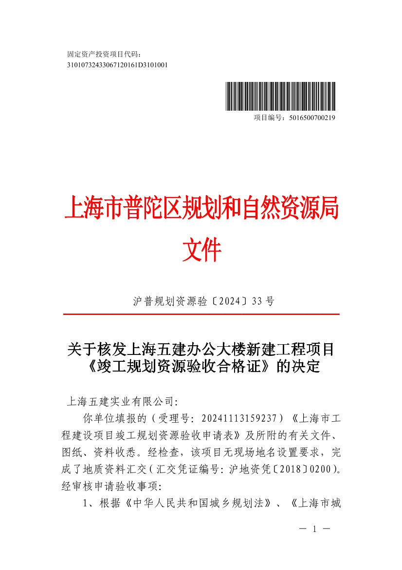 关于核发上海五建办公大楼新建工程项目《竣工规划资源验收合格证》的决定