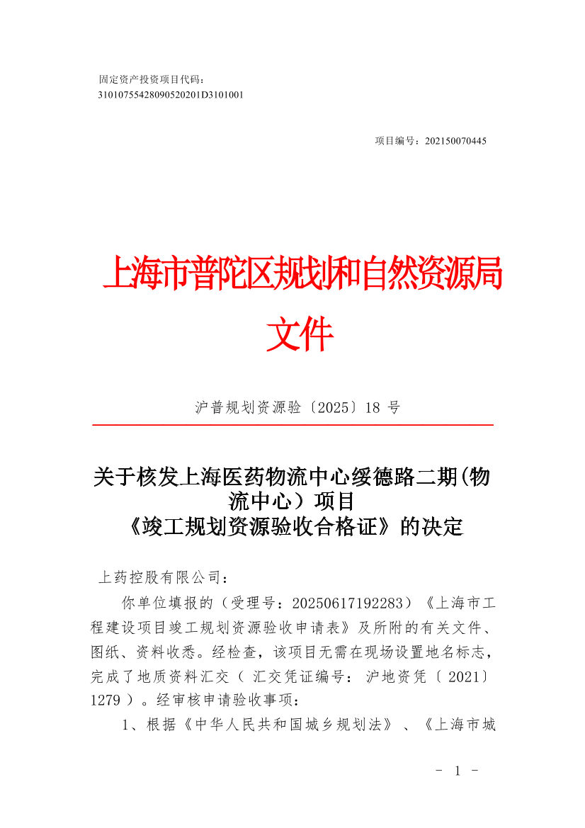 根据《中华人民共和国行政许可法》的规定,准予核发上海医药物流中心绥德路二期项目 (物流中心)项目《上海 市工程建设项目竣工规划资源验收合格证》(编号:沪普规划资源验(2025)JA310107202500873)。