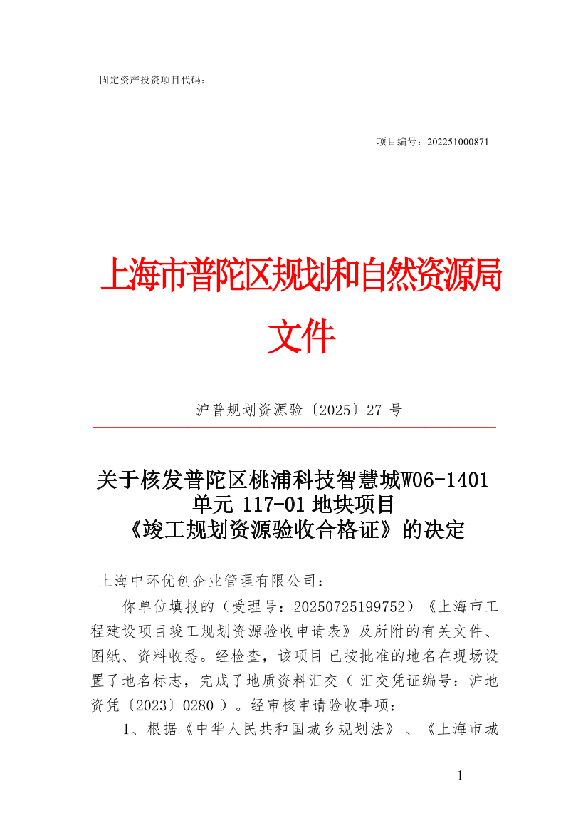 关于核发普陀区桃浦科技智慧城W06-1401单元117-01地块项目《竣工规划资源验收合格证》的决定
