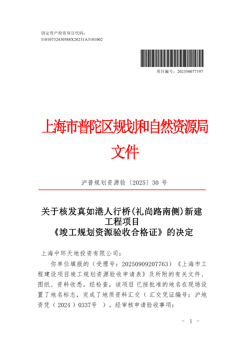 关于核发真如港人行桥(礼尚路南侧)新建工程项目《竣工规划资源验收合格证》的决定