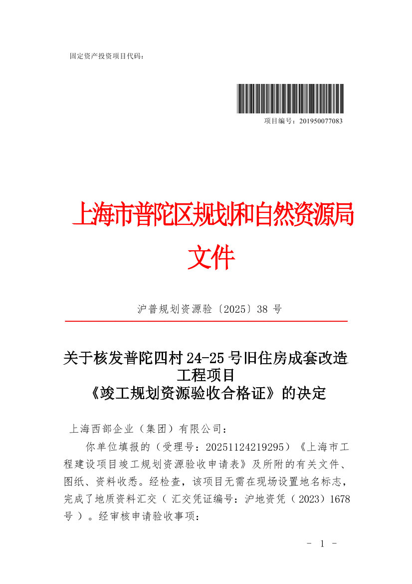 关于核发普陀四村24-25号旧住房成套改造工程项目《竣工规划资源验收合格证》的决定