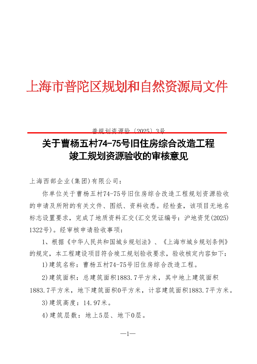 你单位关于曹杨五村74-75号旧住房综合改造工程规划资源验收 的申请及所附的有关文件、图纸、资料收悉。经检查,该项目无地名 标志设置要求,完成了地质资料汇交(汇交凭证编号:沪地资凭(2025) 1322号)。经审核申请验收事项: