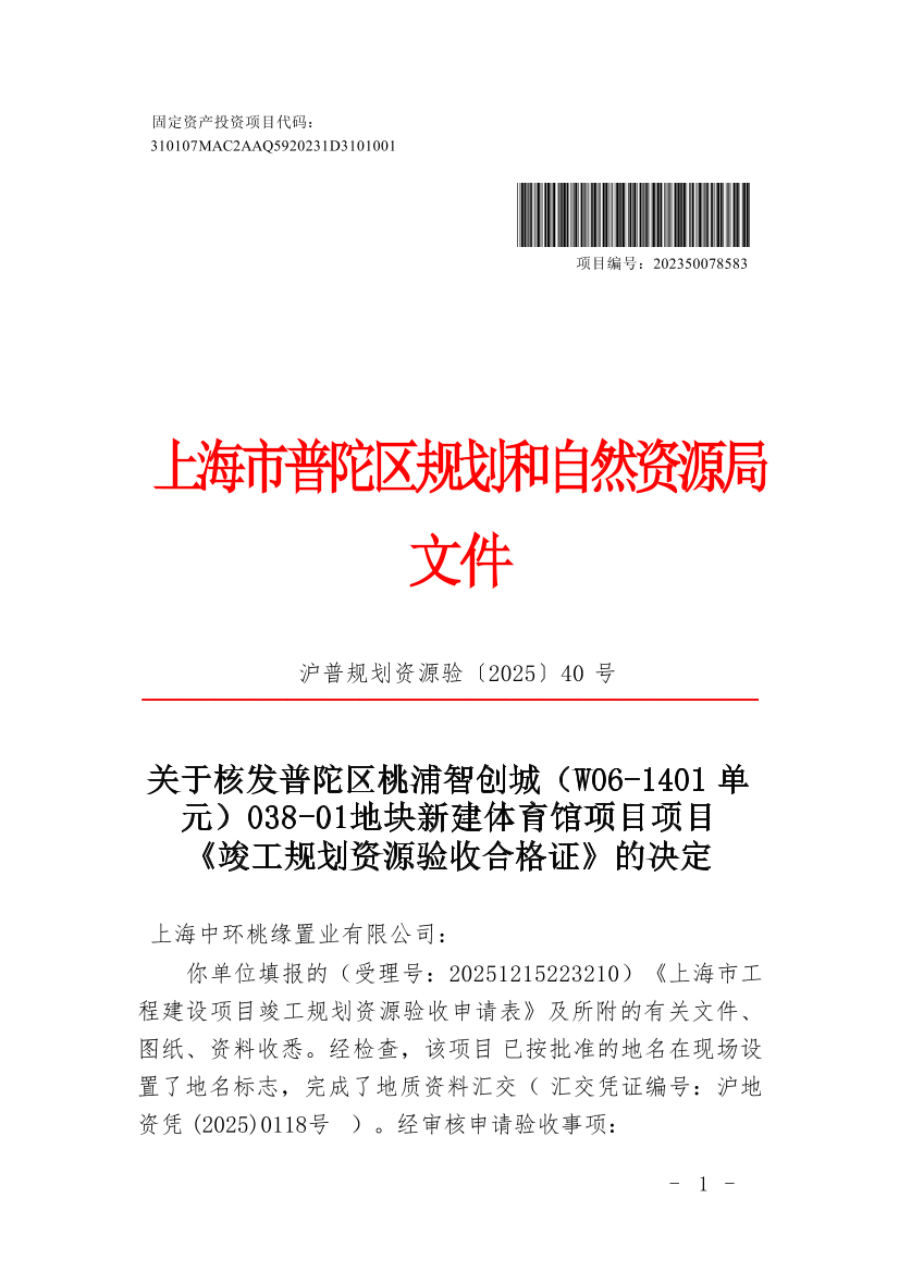 关于核发普陀区桃浦智创城(W06-1401单元)038-01地块新建体育馆项目项目《竣工规划资源验收合格证》的决定