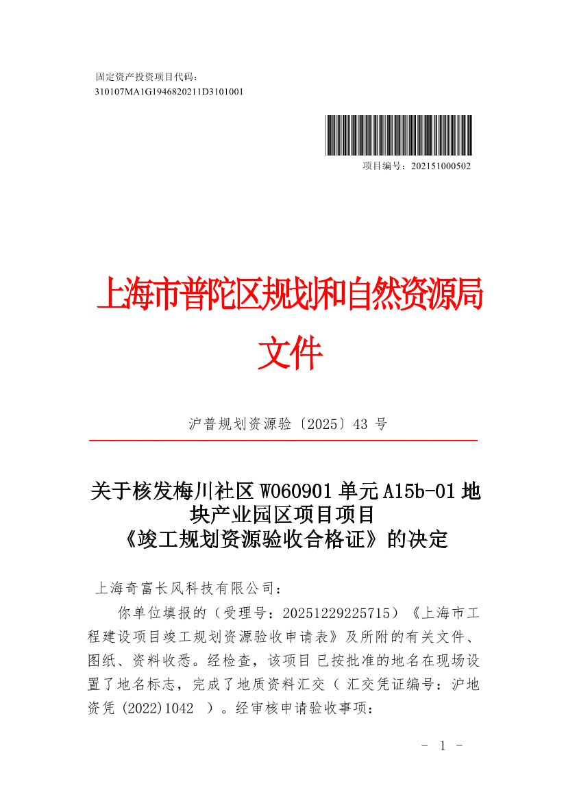 根据《中华人民共和国行政许可法》的规定,准予核发梅川社区W060901单元A15b-01地块产业园区项目项目《上海市工程建设项目竣工规划资源验收合格证》 (编号:沪普规划资源验(2025)JA310107202502135)。