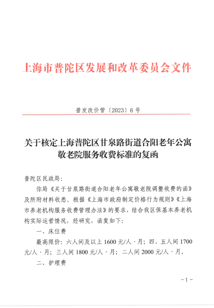 关于核定上海普陀区甘泉路街道合阳老年公寓敬老院服务收费标准的复函