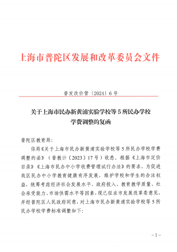 关于上海市民办新黄浦实验学校等5所民办学校学费调整的复函