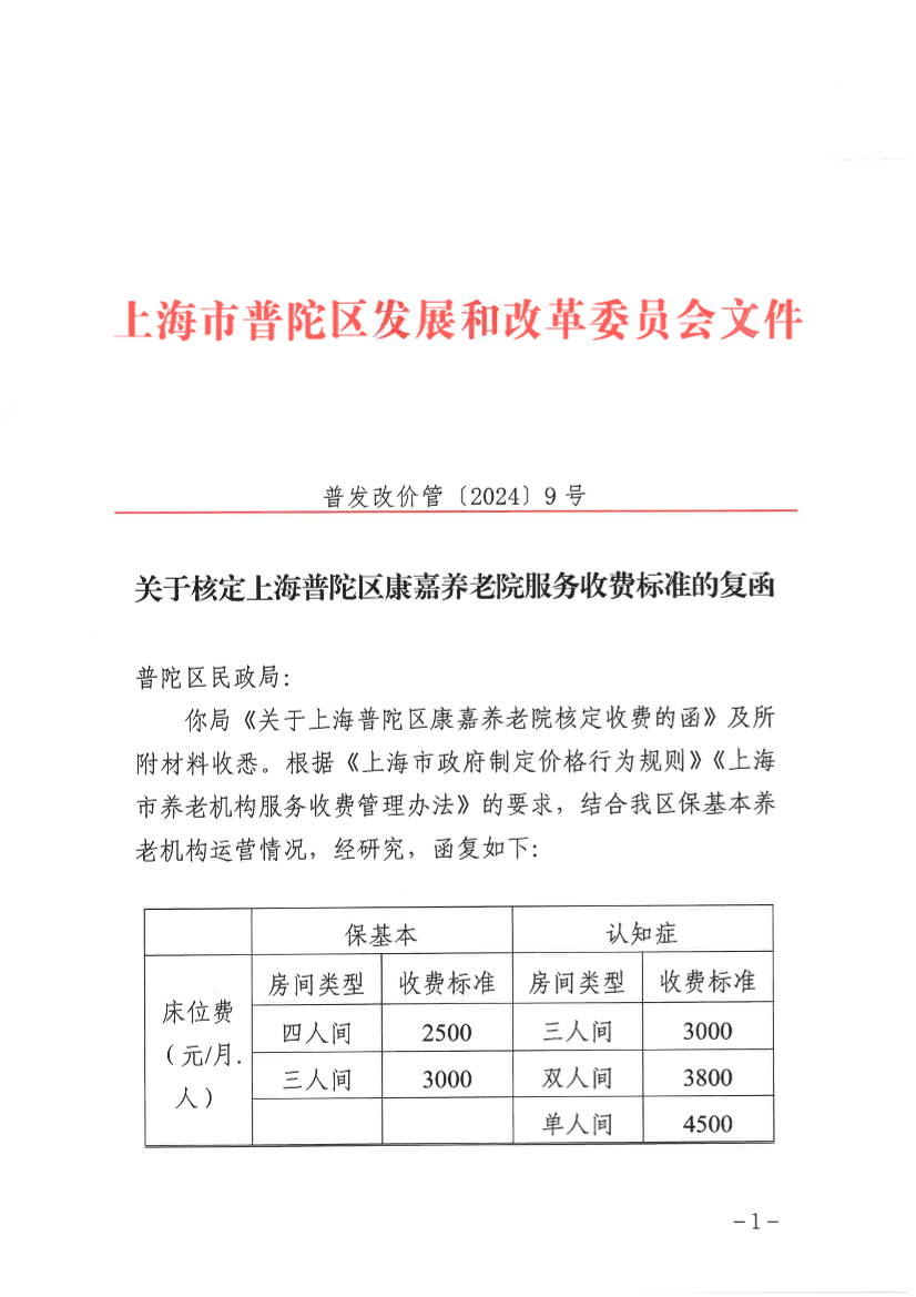 你局《关于上海普陀区康嘉养老院核定收费的函》及所附材料收悉。根据《上海市政府制定价格行为规则》《上海市养老机构服务收费管理办法》的要求,结合我区保基本养老机构运营情况,经研究,函复如下: