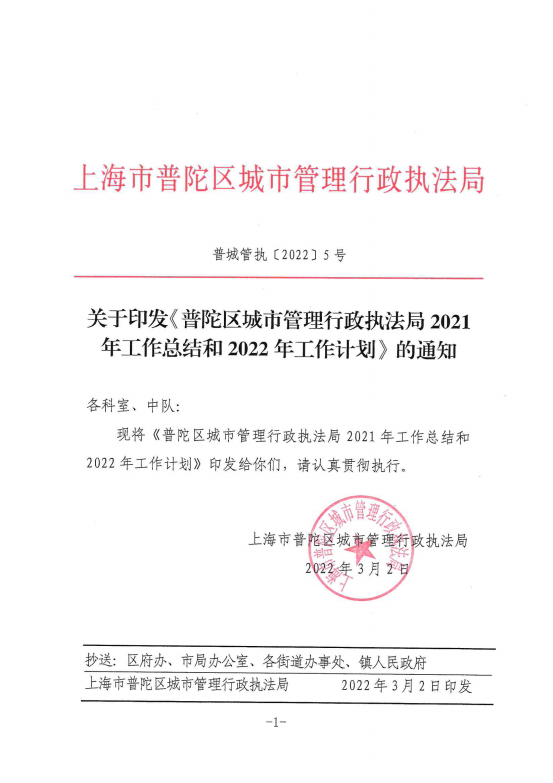 关于印发《普陀区城市管理行政执法局2021年工作总结和2022年工作计划》的通知
