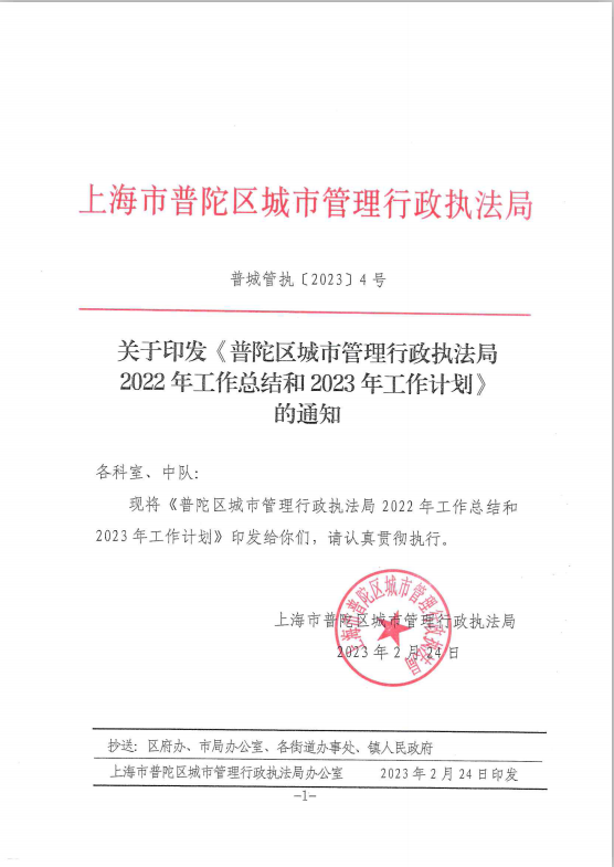 关于印发《普陀区城市管理行政执法局2022年工作总结和2023年工作计划》的通知
