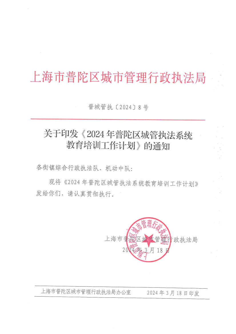 关于印发《2024年普陀区城管执法系统教育培训工作计划》的通知