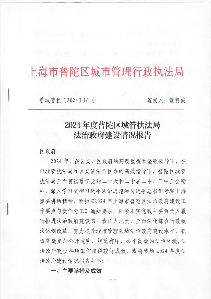 2024年,在区委、区政府的高度重视和坚强领导下,在市城管执法局和区委依法治区办的高效指导下,普陀区城管执法局全面贯彻落实党的二十大和二十届二中、三中全会精神,深入学习贯彻习近平法治思想和习近平总书记考察上海重要讲话精神,紧扣《2024年上海市普陀区法治政府建设工作要点与责任分工》通知要求,压紧压实党政主要负责人履行推进法治政府建设第一责任人职责,全面深化综合行政执法体制改革,努力提升城市管理领域法治政府建设水平,积极营造更加公开透明、规范有序、公平高效的法治环境,法治政府建设各项工作取得较好成效。现将我局2024年度法治政府建设情况报告如下:
