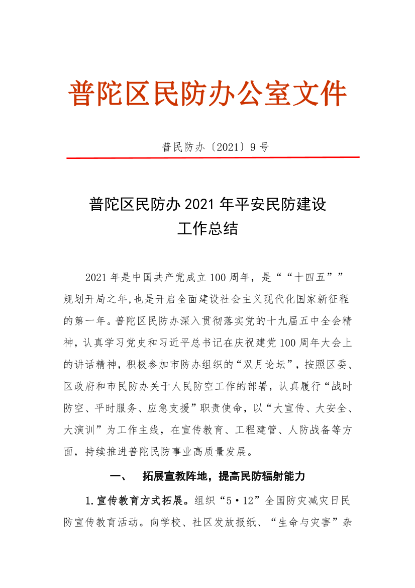 2021年是中国共产党成立100周年,是“十四五”规划开局之年,也是开启全面建设社会主义现代化国家新征程的第一年。普陀区民防办深入贯彻落实党的十九届五中全会精神,认真学习党史和习近平总书记在庆祝建党100周年大会上的重要讲话精神,积极参加市防办组织的“双月论坛”,按照区委、区政府和市民防办关于人民防空工作的部署,认真履行“战时防空、平时服务、应急支援”职责使命,以“大宣传、大安全、大演训”为工作主线,在宣传教育、工程建管、人防战备等方面,持续推进普陀民防事业高质量发展。