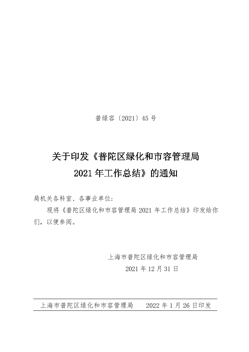 关于印发《普陀区绿化和市容管理局2021年工作总结》的通知