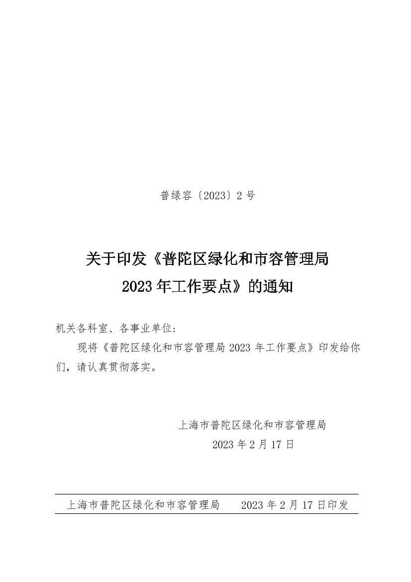 关于印发《普陀区绿化和市容管理局2023年工作要点》的通知