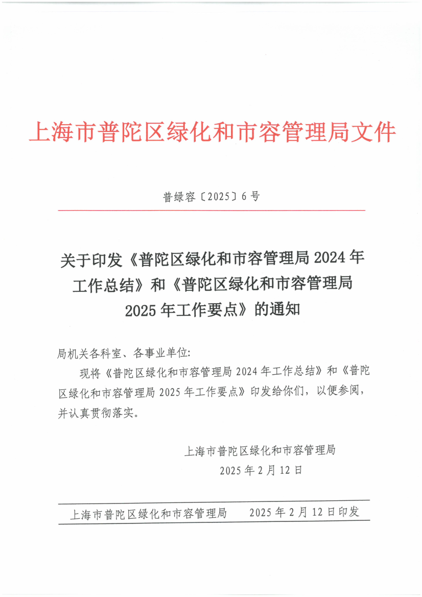 关于印发《普陀区绿化和市容管理局2024年 工作总结》和《普陀区绿化和市容管理局 2025年工作要点》的通知