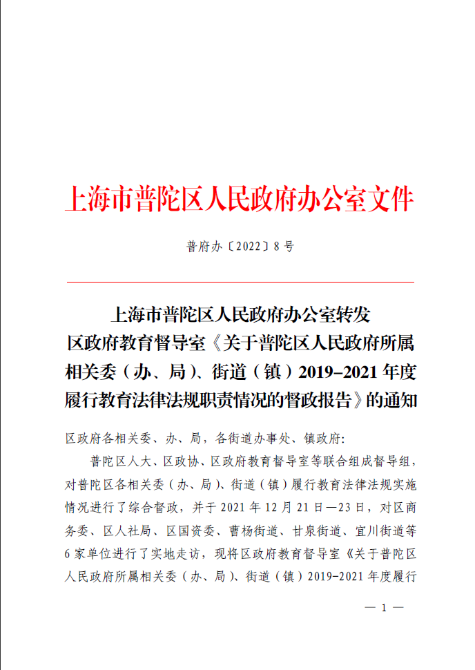 上海市普陀区人民政府办公室转发区政府教育督导室《关于普陀区人民政府所属相关委(办、局)、街道(镇)2019-2021年度履行教育法律法规职责情况的督政报告》的通知