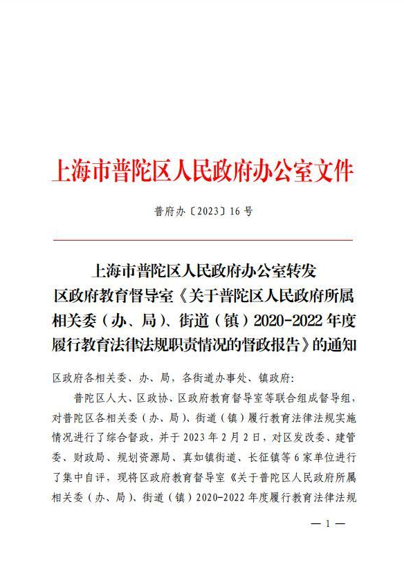 普陀区人大、区政协、区政府教育督导室等联合组成督导组,对普陀区各相关委(办、局)、街道(镇)履行教育法律法规实施情况进行了综合督政,并于2023年2月2日,对区发改委、建管委、财政局、规划资源局、真如镇街道、长征镇等6家单位进行了集中自评,现将区政府教育督导室《关于普陀区人民政府所属相关委(办、局)、街道(镇)2020-2022年度履行教育法律法规职责情况的督政报告》转发给你们。希望各单位进一步做好教育法律法规的落实工作,推进全国义务教育优质均衡区、学前普及普惠区创建及“双减”工作等重点任务落实,推动教育现代化强区建设。
