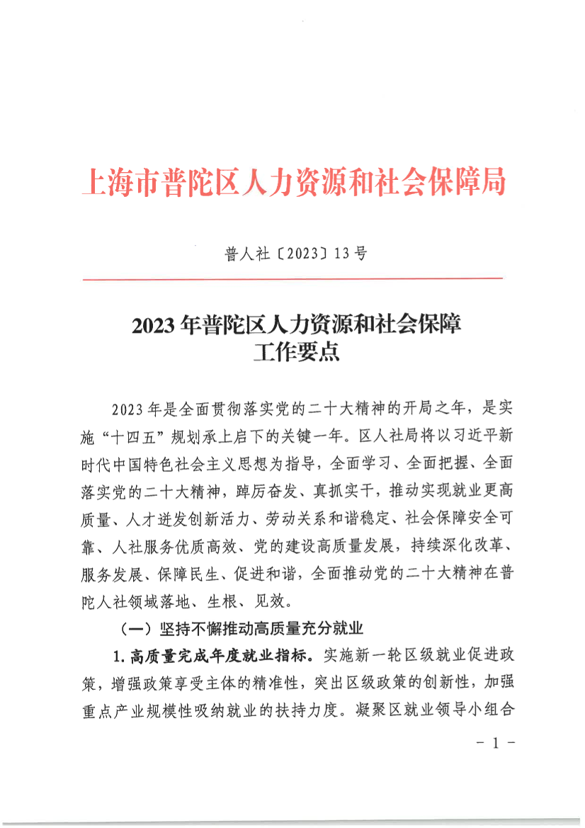 2023年是全面贯彻落实党的二十大精神的开局之年,是实施“十四五”规划承上启下的关键一年。区人社局将以习近平新时代中国特色社会主义思想为指导,全面学习、全面把握、全面落实党的二十大精神,踔厉奋发、真抓实干,推动实现就业更高质量、人才迸发创新活力、劳动关系和谐稳定、社会保障安全可靠、人社服务优质高效、党的建设高质量发展,持续深化改革、服务发展、保障民生、促进和谐,全面推动党的二十大精神在普陀人社领域落地、生根、见效。