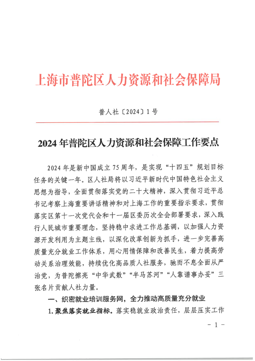 2024年普陀区人力资源和社会保障工作要点