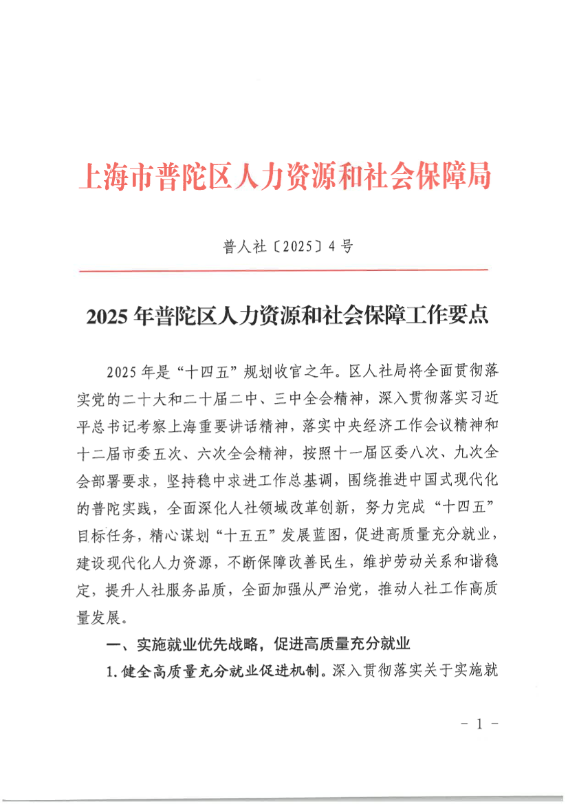 2025年普陀区人力资源和社会保障工作要点
