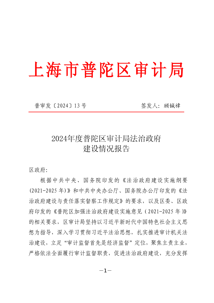 根据中共中央、国务院印发的《法治政府建设实施纲要(2021-2025年)》和中共中央办公厅、国务院办公厅印发的《法治政府建设与责任落实督察工作规定》的要求,以及区委、区政府印发的《普陀区加强法治政府建设实施意见(2021-2025年)》的相关要求,区审计局坚持以习近平新时代中国特色社会主义思想为指导,深入学习贯彻习近平法治思想,扎实推进审计机关法治建设,立足“审计监督首先是经济监督”定位,聚焦主责主业,严格依法全面履行审计监督职责,促进法治政府建设,充分发挥审计在党和国家监督体系中的重要作用。现将我局2024年度法治政府建设情况报告如下: