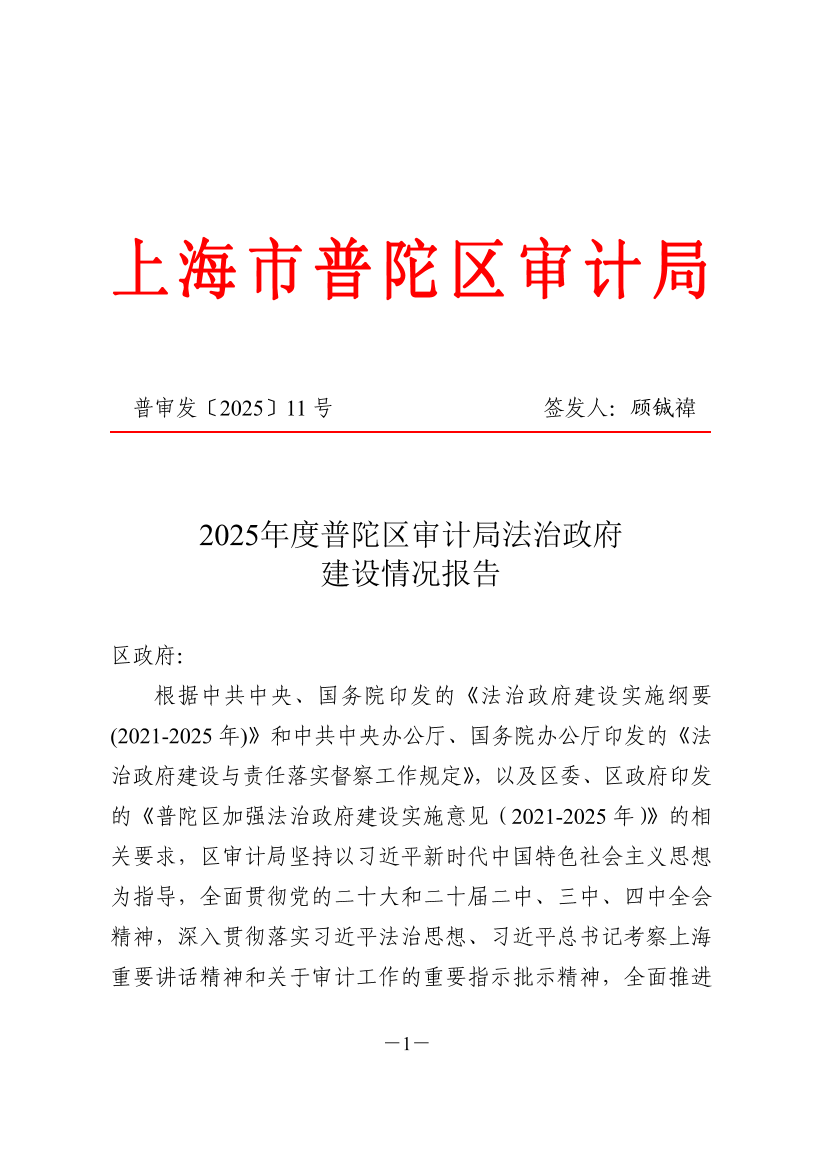 根据中共中央、国务院印发的《法治政府建设实施纲要(2021-2025年)》和中共中央办公厅、国务院办公厅印发的《法治政府建设与责任落实督察工作规定》,以及区委、区政府印发的《普陀区加强法治政府建设实施意见(2021-2025年)》的相关要求,区审计局坚持以习近平新时代中国特色社会主义思想为指导,全面贯彻党的二十大和二十届二中、三中、四中全会精神,深入贯彻落实习近平法治思想、习近平总书记考察上海重要讲话精神和关于审计工作的重要指示批示精神,全面推进审计工作法治化、规范化、科学化。现将我局2025年度法治政府建设情况报告如下: