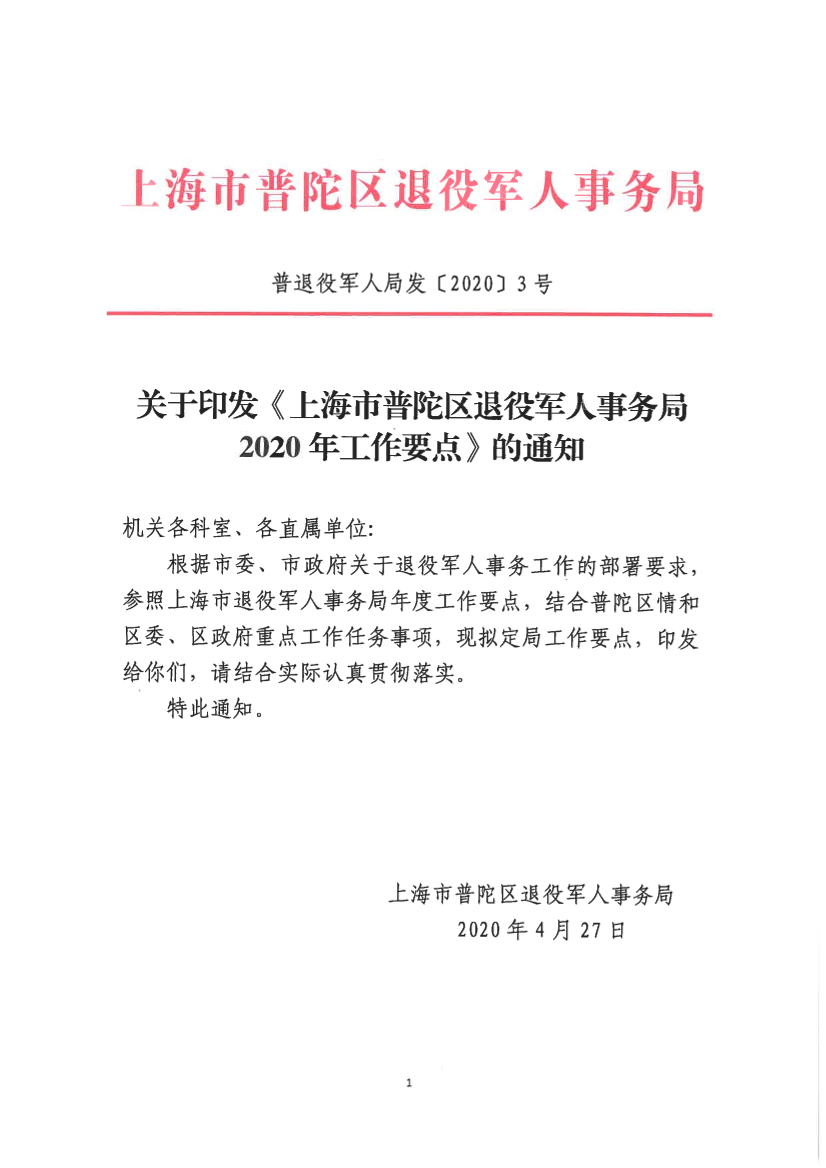 关于印发《上海市普陀区退役军人事务局2020年工作要点》的通知