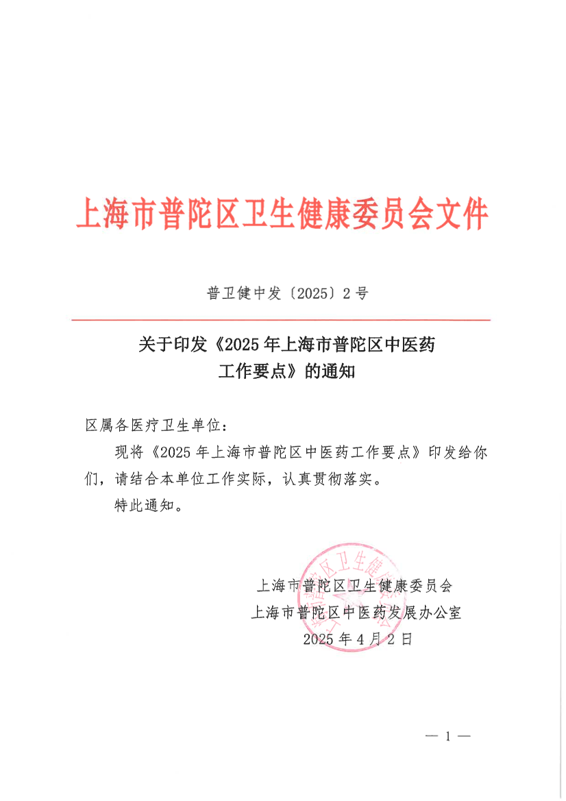 关于印发《2025年上海市普陀区中医药工作要点》的通知