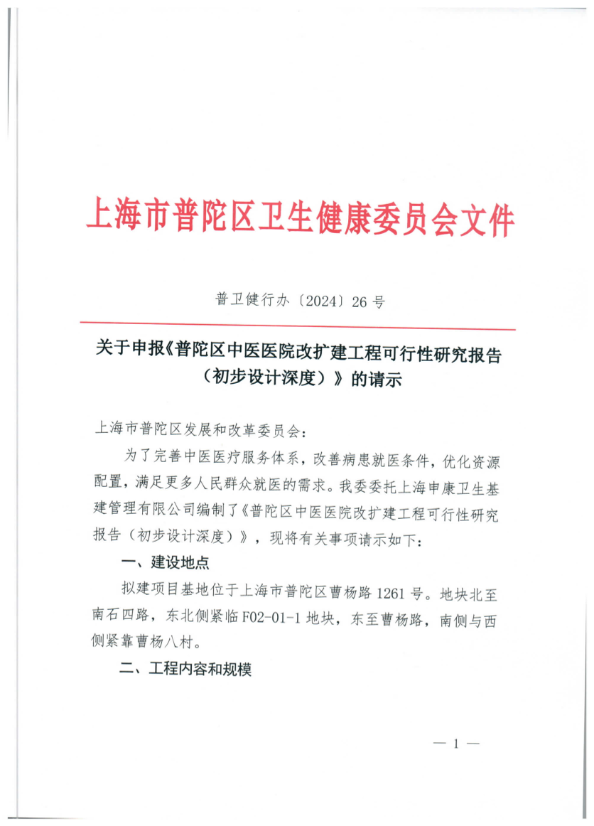 为了完善中医医疗服务体系,改善病患就医条件,优化资源配置,满足更多人民群众就医的需求。我委委托上海申康卫生基建管理有限公司编制了《普陀区中医医院改扩建工程可行性研究报告(初步设计深度)》,现将有关事项请示如下: