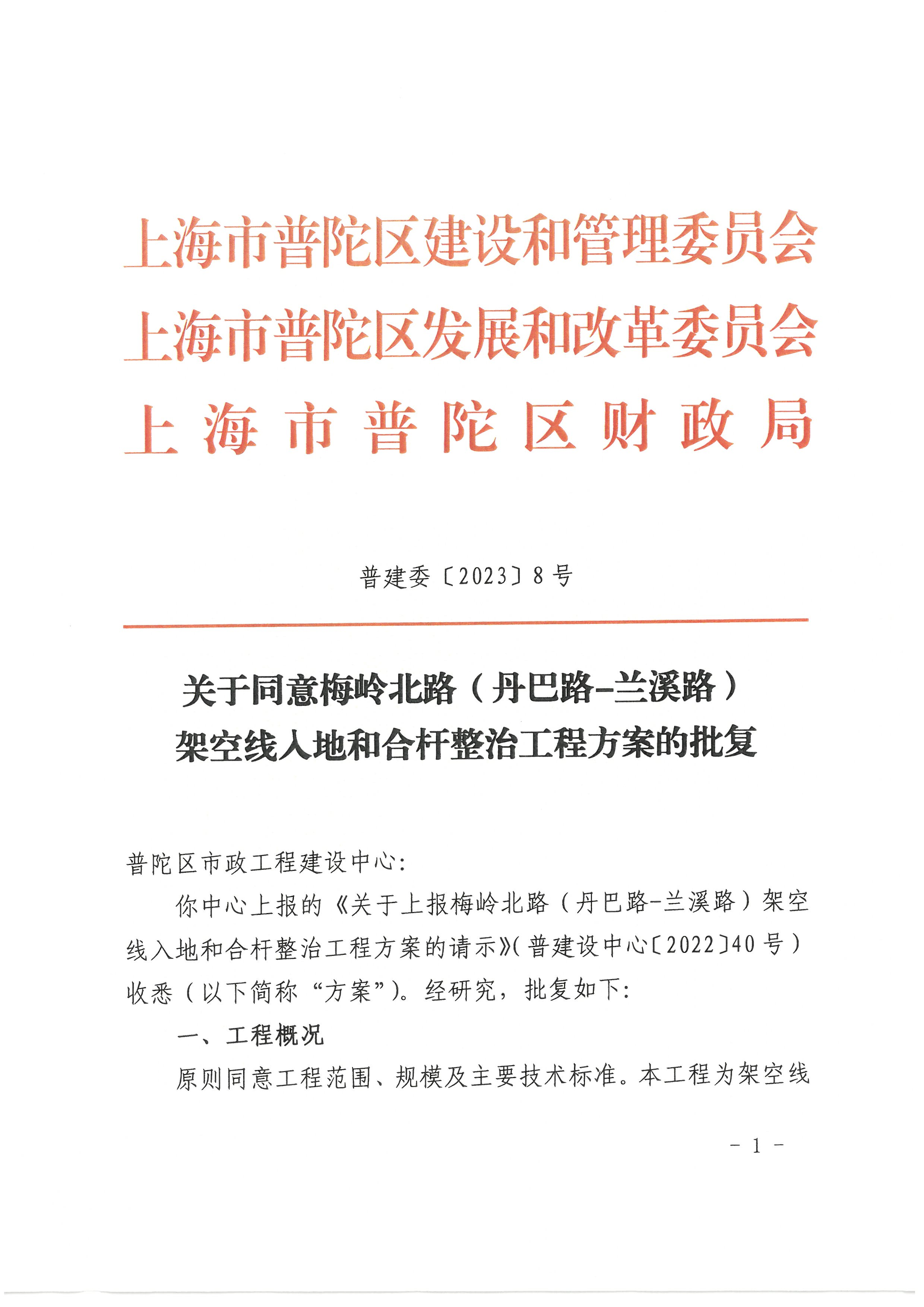 你中心上报的《关于上报梅岭北路(丹巴路-兰溪路)架空线入地和合杆整治工程方案的请示》(普建设中心〔2022〕40号)收悉(以下简称“方案”)。经研究,批复如下: