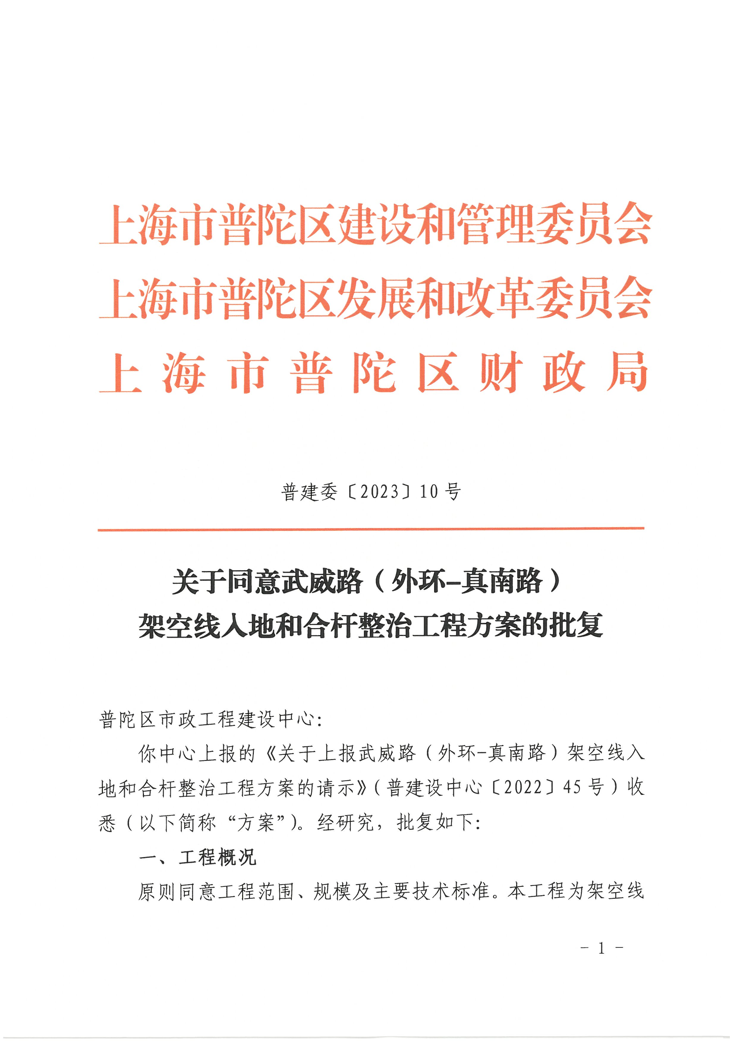 你中心上报的《关于上报武威路(外环-真南路)架空线入地和合杆整治工程方案的请示》(普建设中心〔2022〕45号)收悉(以下简称“方案”)。经研究,批复如下: