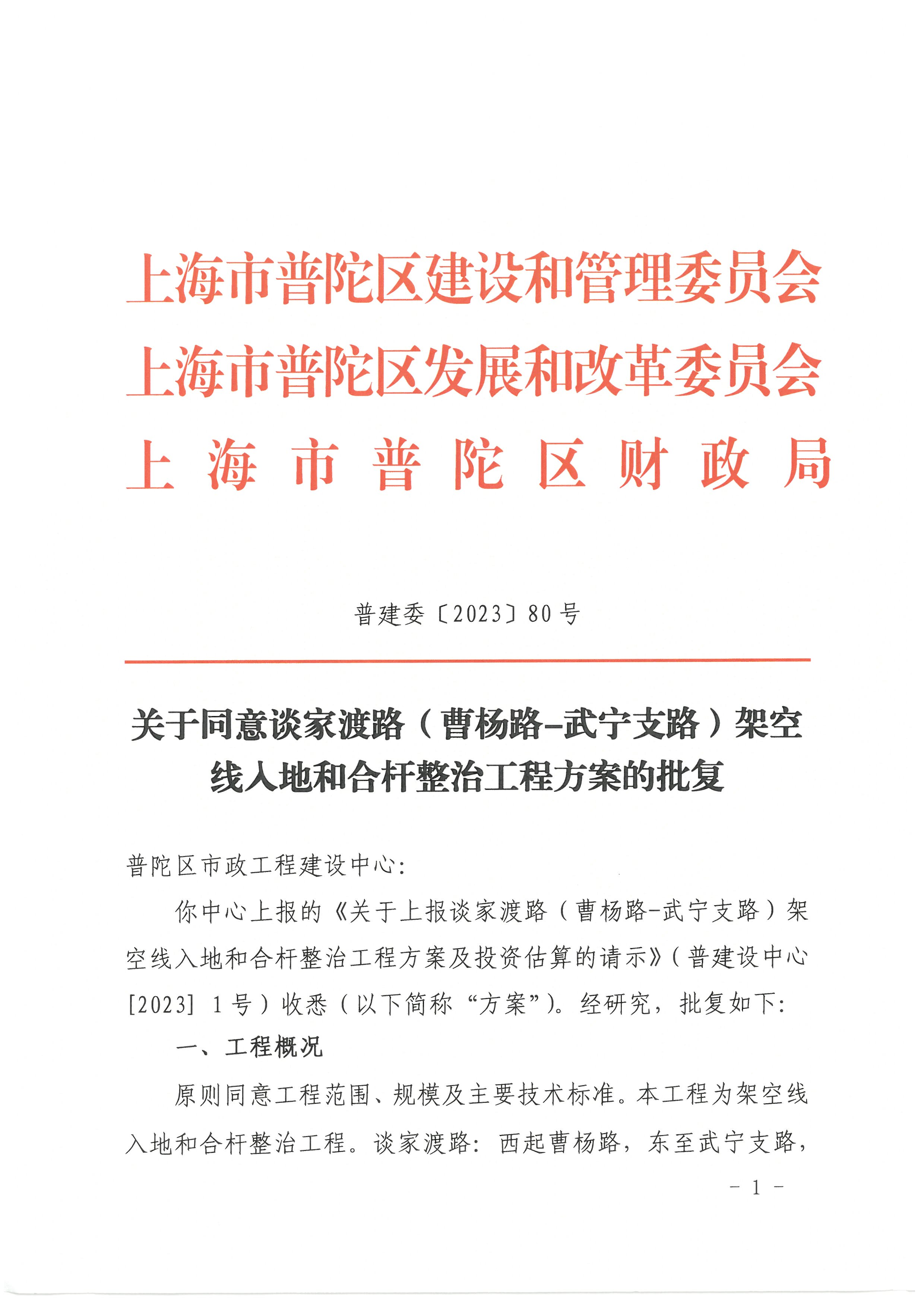 你中心上报的《关于上报谈家渡路(曹杨路-武宁支路)架空线入地和合杆整治工程方案及投资估算的请示》(普建设中心[2023] 1号)收悉(以下简称“方案”)。经研究,批复如下: