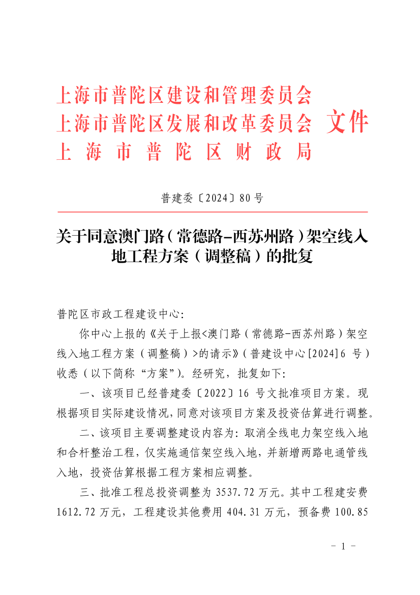 你中心上报的《关于上报<澳门路(常德路-西苏州路)架空线入地工程方案(调整稿)>的请示》(普建设中心[2024]6号)收悉(以下简称“方案”)。经研究,批复如下: