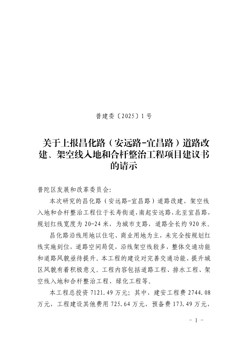 关于上报昌化路(安远路-宜昌路)道路改建、架空线入地和合杆整治工程项目建议书的请示