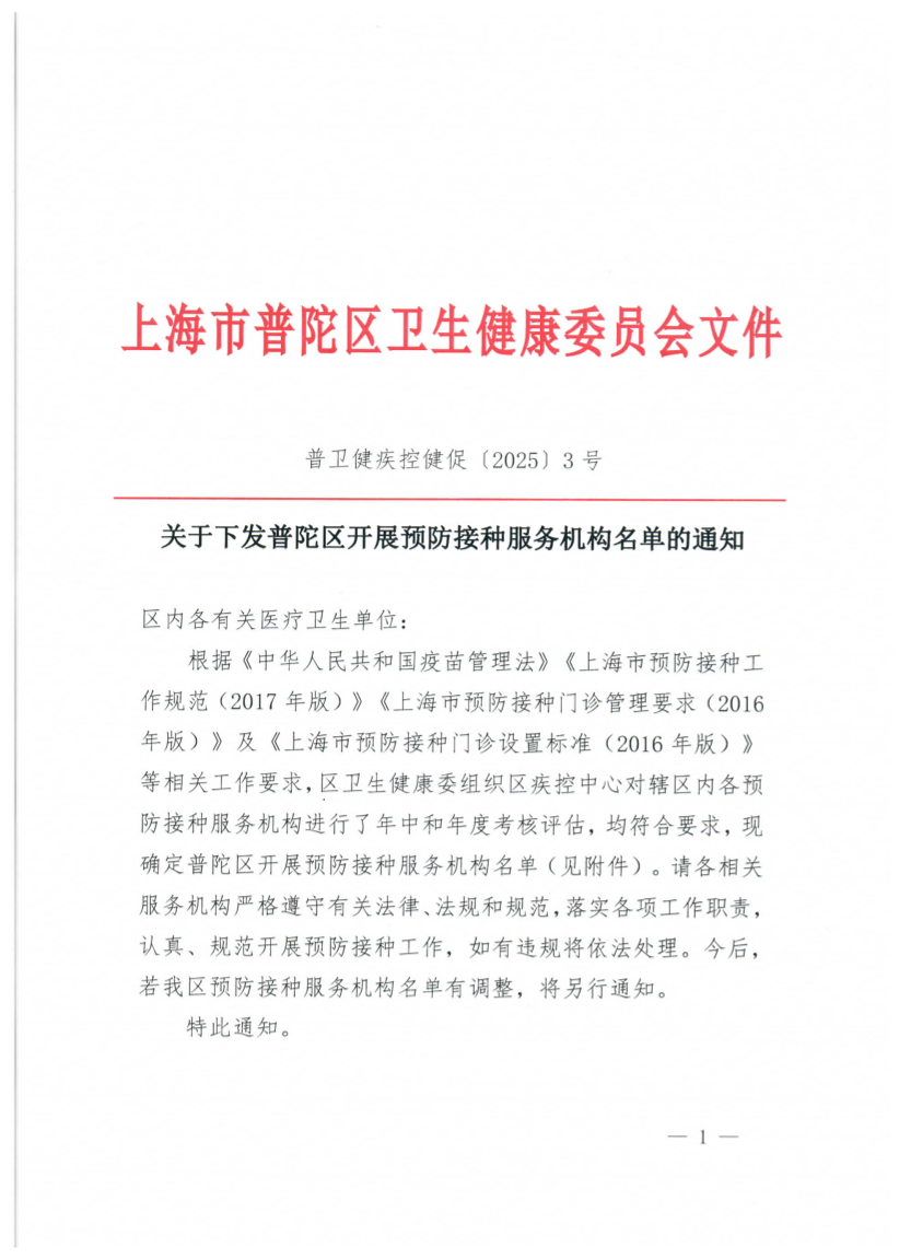 根据《中华人民共和国疫苗管理法》《上海市预防接种工作规范(2017年版)》《上海市预防接种门诊管理要求(2016年版)》及《上海市预防接种门诊设置标准(2016年版)》等相关工作要求,区卫生健康委组织区疾控中心对辖区内各预防接种服务机构进行了年中和年度考核评估,均符合要求,现确定普陀区开展预防接种服务机构名单(见附件)。请各相关服务机构严格遵守有关法律、法规和规范,落实各项工作职责,认真、规范开展预防接种工作,如有违规将依法处理。今后,若我区预防接种服务机构名单有调整,将另行通知。