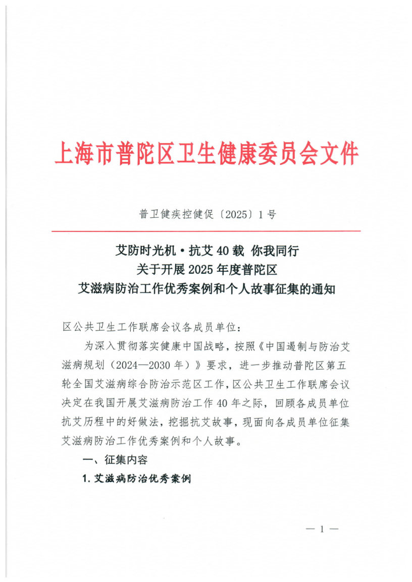 艾防时光机·抗艾40载 你我同行关于开展2025年度普陀区艾滋病防治工作优秀案例和个人故事征集的通知