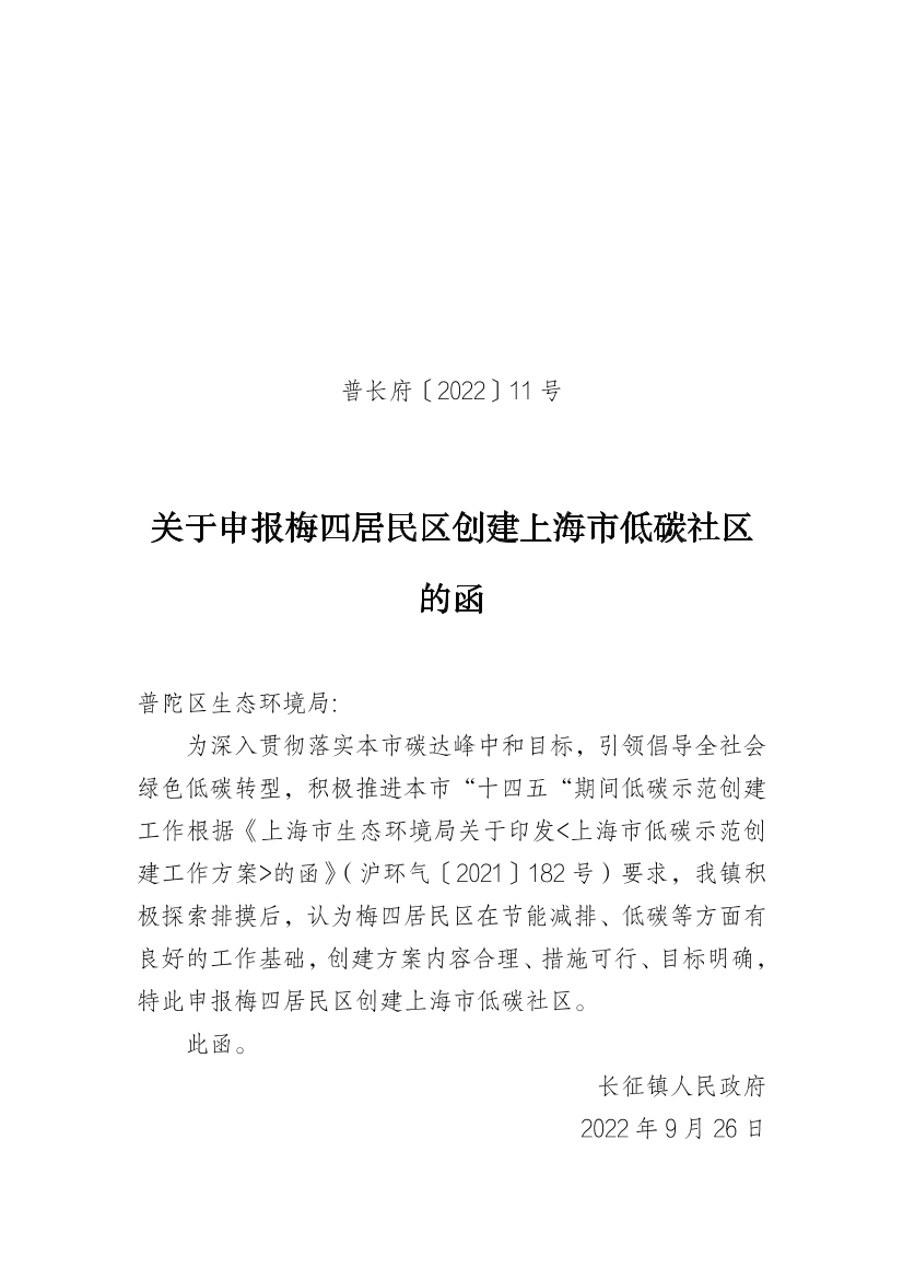 为深入贯彻落实本市碳达峰中和目标,引领倡导全社会绿色低碳转型,积极推进本市““十四五”“期间低碳示范创建工作根据《上海市生态环境局关于印发<上海市低碳示范创建工作方案>的函》(沪环气〔2021〕182号)要求,我镇积极探索排摸后,认为梅四居民区在节能减排、低碳等方面有良好的工作基础,创建方案内容合理、措施可行、目标明确,特此申报梅四居民区创建上海市低碳社区。