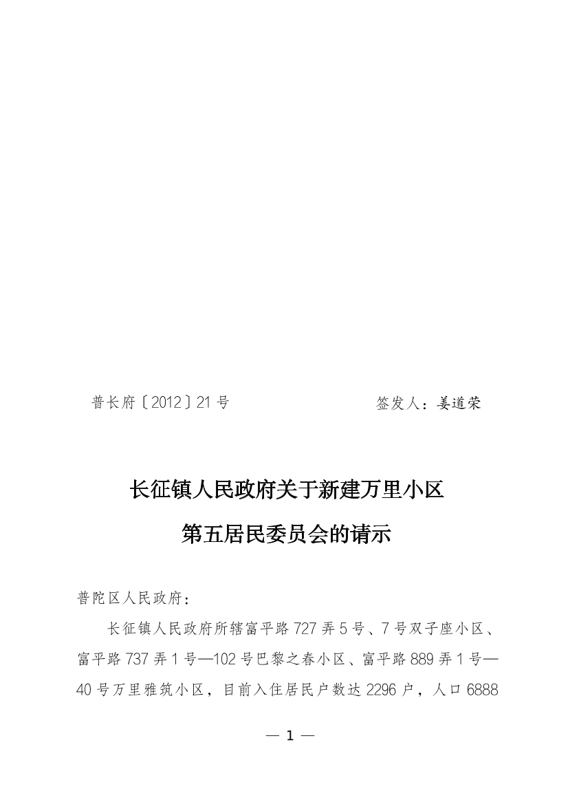 长征镇人民政府所辖富平路727弄5号、7号双子座小区、富平路737弄1号—102号巴黎之春小区、富平路889弄1号—40号万里雅筑小区,目前入住居民户数达2296户,人口6888人,居委会办公用房面积为258平方米,于2011年5月起筹建居委会,办公设施均已配齐,居委会干部配备到位。为便于社区管理和居民自治,拟新建万里小区第五居民委员会。管辖范围:东至真华路,西至水泉路,南至交通路,北至富平路。