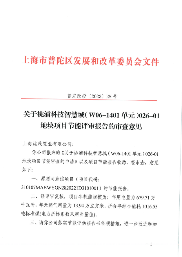 你公司报来的《关于桃浦科技智慧城(W06-1401单元)026-01地块项目节能审查的申请》以及项目节能报告收悉。经审查,意见如下: