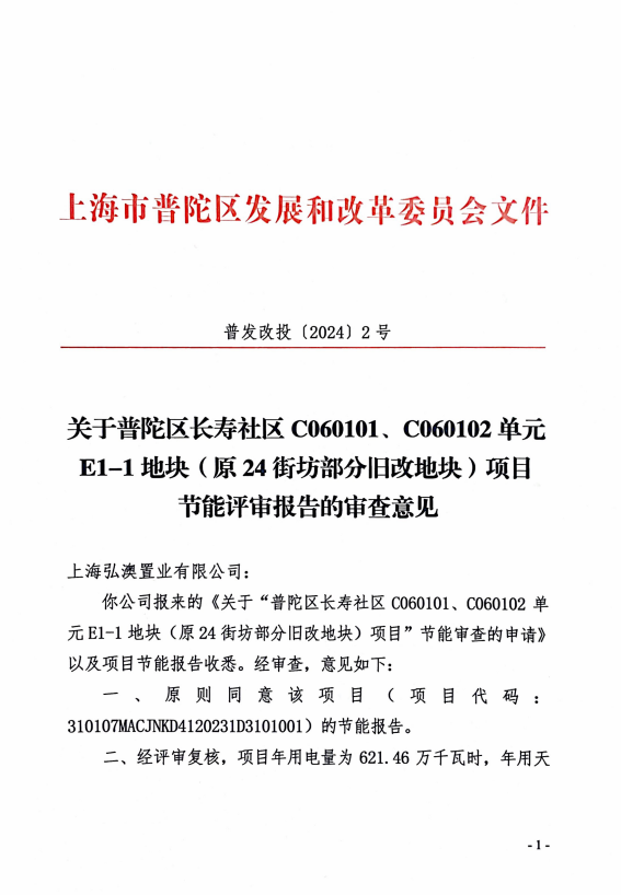 你公司报来的《关于“普陀区长寿社区C060101、C060102单元E1-1地块(原24街坊部分旧改地块)项目”节能审查的申请》以及项目节能报告收悉。经审查,意见如下: