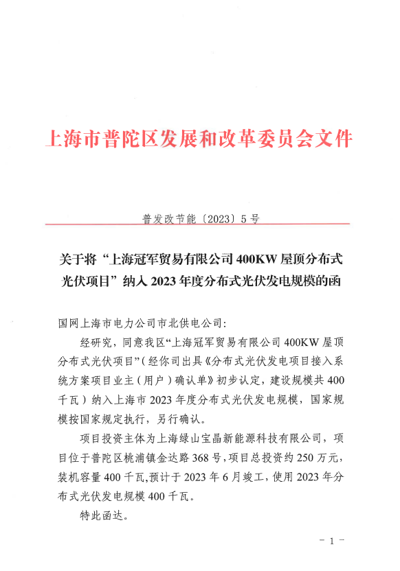 关于将“上海冠军贸易有限公司400KW屋顶分布式光伏项目”纳入2023年度分布式光伏发电规模的函