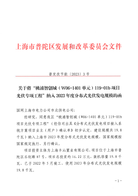 经研究,同意我区“桃浦智创城(W06-1401单元)119-01b项目光伏专项工程”(经你司出具《分布式光伏发电项目接入系统方案项目业主(用户)确认单》初步认定,建设规模共19.8千瓦)纳入上海市2023年度分布式光伏发电规模,国家规模按国家规定执行,另行确认。